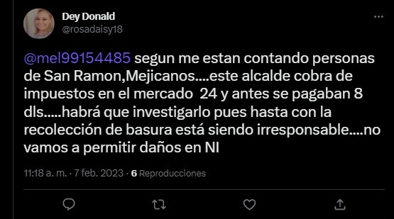 “Según me están contando personas de San Ramon, Mejicanos….este alcalde cobra de impuestos en el mercado 24 y antes se pagaban 8 dls…..habrá que investigarlo pues hasta con la recolección de basura está siendo irresponsable….no vamos a permitir daños”, indicó la usuaria en Twitter Dey Donald.