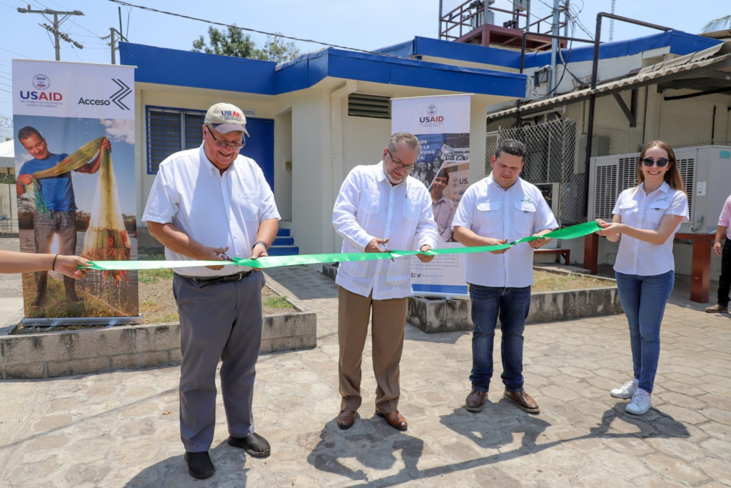 USAID y Acceso El Salvador han equipado la planta procesadora y ayudado a obtener los permisos de la División de Inspección de Productos de Origen Animal (DIPOA) de la Dirección General de Sanidad Vegetal y Animal (DGSVA) y del Centro Nacional de Desarrollo Pesquero (CENDEPESCA), todas dependencias del Ministerio de Agricultura y Ganadería (MAG), y del Ministerio de Medio Ambiente y Recursos Naturales (MARN) para la instalación y operación de la planta. El apoyo incluyó guiar al personal técnico a través del proceso de solicitud, abordar los requisitos ambientales y operativos, y garantizar el cumplimiento de todos los requisitos legales. Además, Acceso El Salvador continuará con asistencia técnica y capacitaciones de productores acuícolas (tilapia y camarón) y pescadores artesanales que participan en la iniciativa.