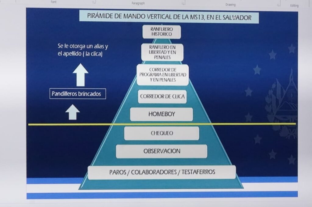 Un analista experto de la División Élite contra el Crimen Organizado presentó un análisis integral en el que afirmó que la MS-13 operaba como una maquinaria de mando rígida, que iba desde la denominada Ranfla Histórica hasta colaboradores y testaferros. Según el perito, la organización contaba con 34 programas y 230 clicas distribuidas en El Salvador, Los Ángeles y México, regidas por un “testamento” de 103 reglas internas.